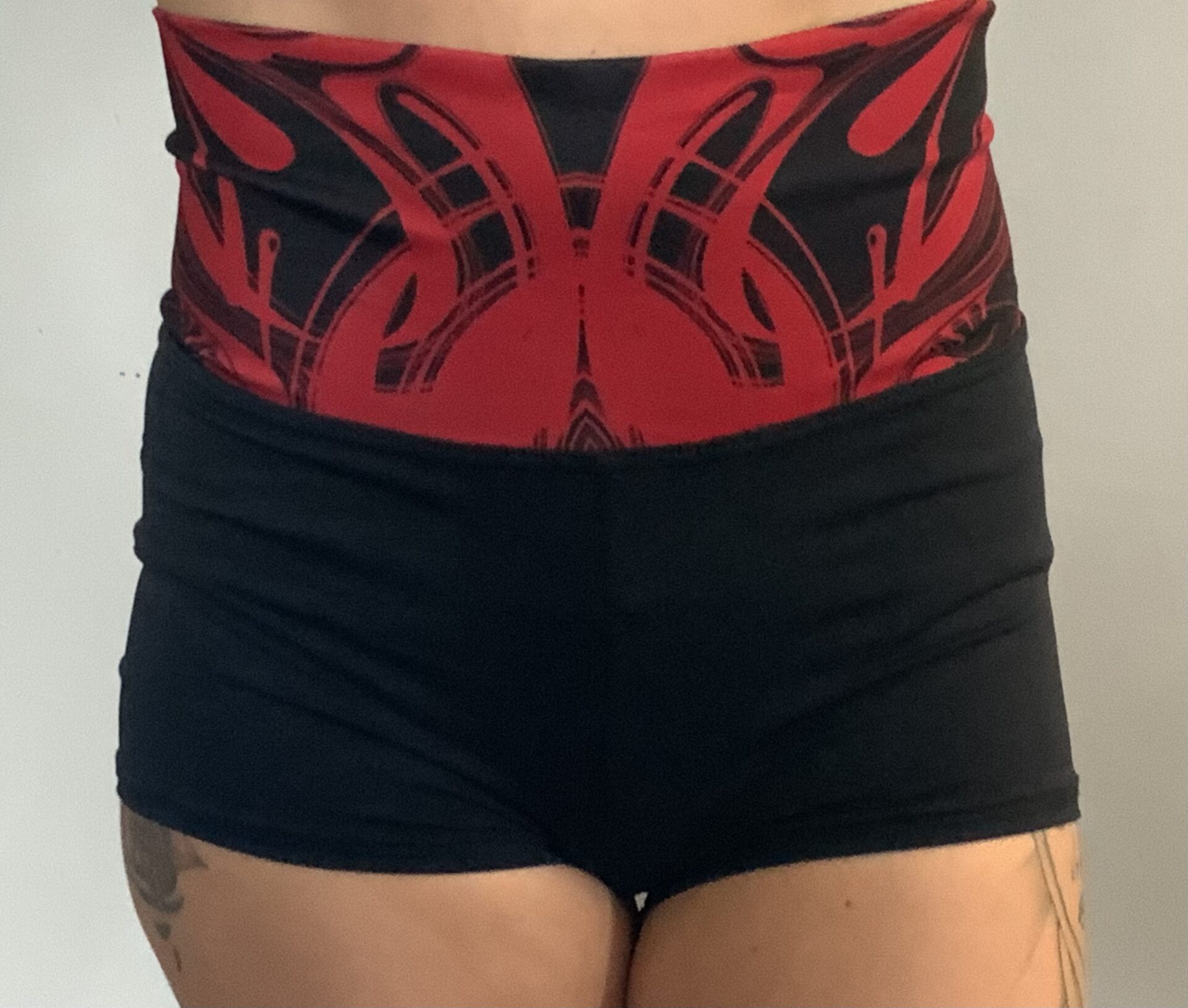 Stretchy black based shorts with Pagan’s Pole unique design roll top, wear high as a backwarmer or roll to the hips. Available with or without scrunch bum